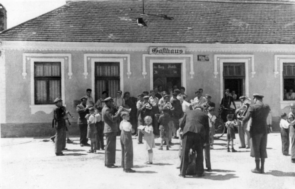 Am Kirtagsonntag stand die Mutter schon zeitig auf. Noch vor dem Kirchgang holten Vater und Mutter das Rindfleisch und das Bratl vom Keller. Wir Buben ließen uns nach der hl. Messe den ganzen Vormittag nicht mehr blicken. Wir waren nur mehr im Wirtshaus zu finden. Gegen halb zwölf trafen die ersten Musikanten ein. Da wir Buben sc:hon beim Oberlehrer „s‘ Geigna“. lernten, fühlten wir uns zum Notnhalten bevorzugt. Welch eine Ehre war es, wenn man das Notenbücherl des Kapellmeisters halten durfte. Um 12 Uhr begann das Stücklblasen. Vor dem Wirtshaus im Kreis aufgestellt spielte die Kapelle drei Märsche. Die Irkenburschen jauchzten, der älteste schwang den Robisch und hielt in der anderen Hand eine Flasche Wein. Nach dem Stücklblasen ging es zum Essen.